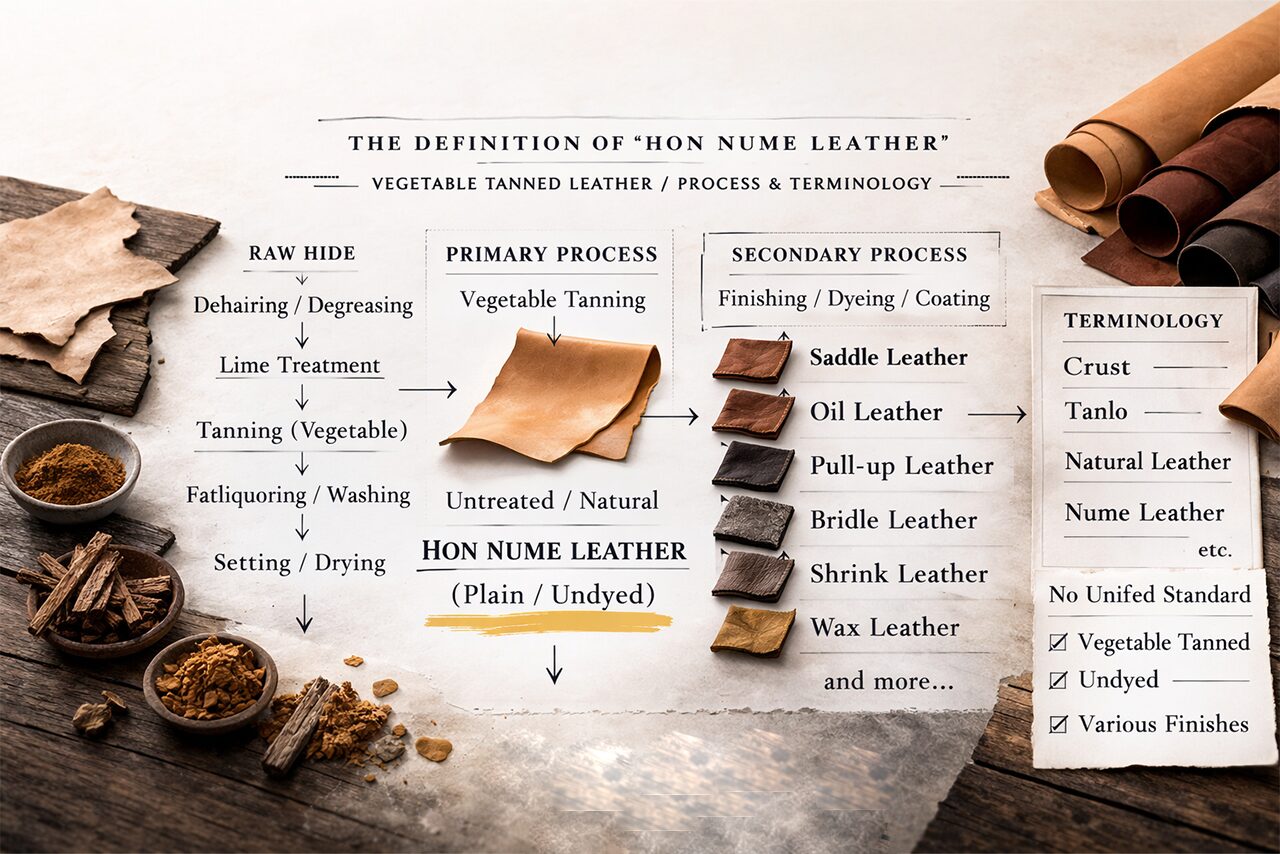 ※本ヌメ革は公的に統一された規格名ではなく、現場(タンナー・流通・作り手)で用法が揺れることがあります。